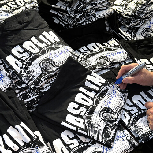 These shirts are the Super Bee edition of my Gasoline Forever design, and for the first time ever, I’ve signed them with a huge Sharpie in blue on the white design. So it pops.