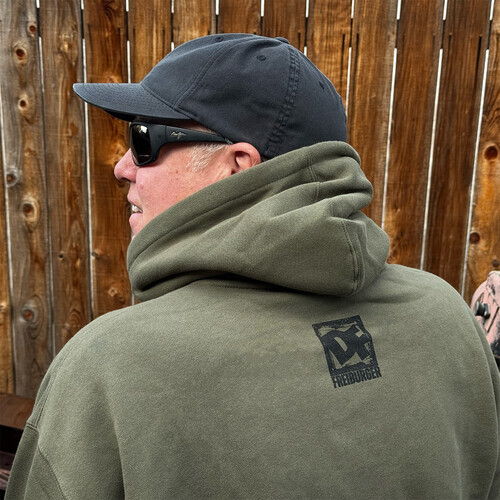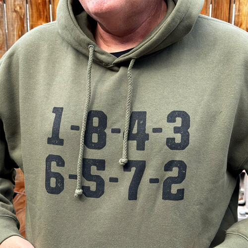 The 1-8-4-3-6-5-7-2 code of life has gone big on D/F t-shirts of assorted colors and on black and blue hoodies, and now I have them in one of my favorite colors—olive drab! Or army green, or combat green, or “going commando,” or whatever. No matter what you name it, you’re going to look good and you’re going to have that classic V8 firing order right up front to tell the world you’re a gearhead.