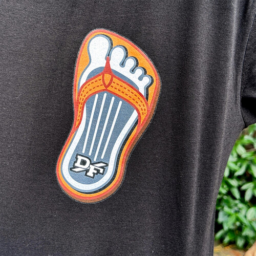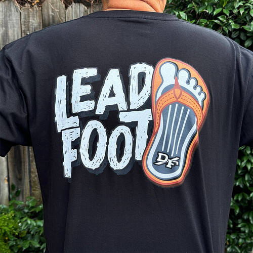 Lead Foot T-shirts have the flip-flop and lettering on the back with a smaller flip-flop on the left breast. The shirts are black, 100% cotton, and made in the USA.