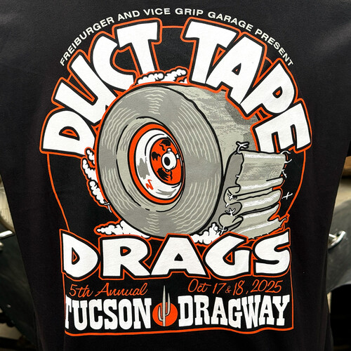 The Duct Tape Drags event is booming, with more folks than ever digging the lifestyle of “don’t get it right, just get it running” and getting together for a party with like-minded gearheads. Now you can celebrate the vibe with an official t-shirt from the 2025 Duct Tape Drags, with the roll of tape gettin’ down in artwork by “The Hot,” Chris Horner of Vibrolas.